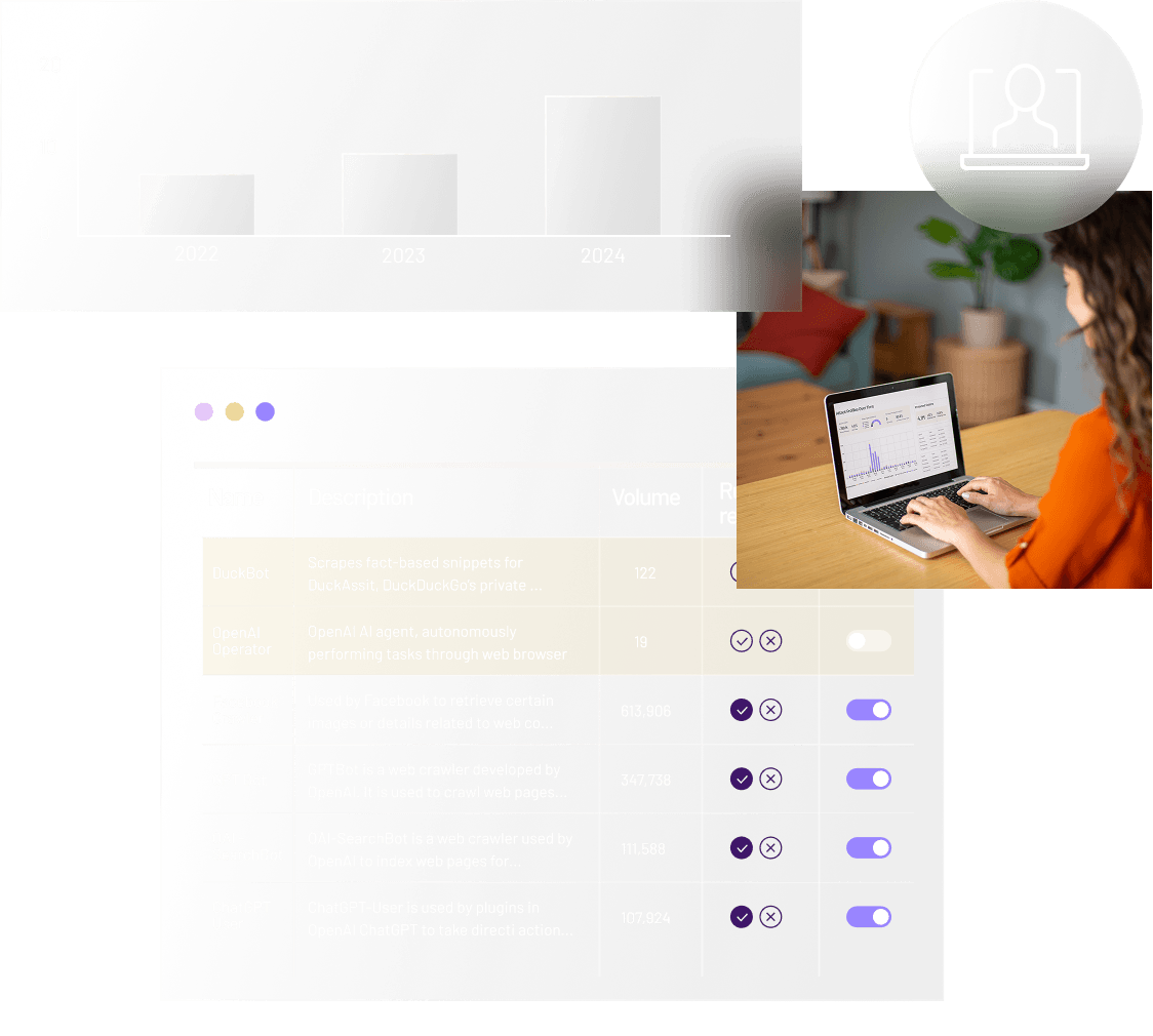 Identify and classify AI agents across your sites and apps, including their provider, type, and trust level. Understand who is driving discovery, engagement, and conversions.