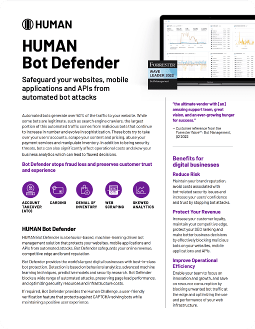 “We didn’t realize how much performance we gave up by having our servers behind the reverse-proxy. After deploying Application Protection we saw our average response time improve by 400ms, a reduction of over 30%. In addition, HUMAN accelerated the execution of our vision of modern microservices-based web architecture.”