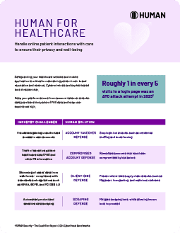Bad actors target healthcare organizations to steal patient data and make a profit. A HUMAN study found that roughly one in every five visits to a login page was an account takeover (ATO) attack attempt in 2023.