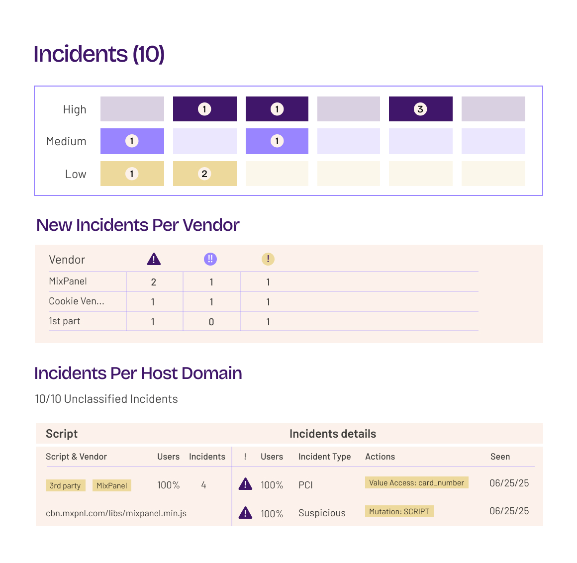 Get details on client-side 1st- and Nth- party scripts, including provenance, vulnerabilities, and cookies. See scripts’ DOM, storage, and network actions, such as sensitive data access and risky-domain communication.