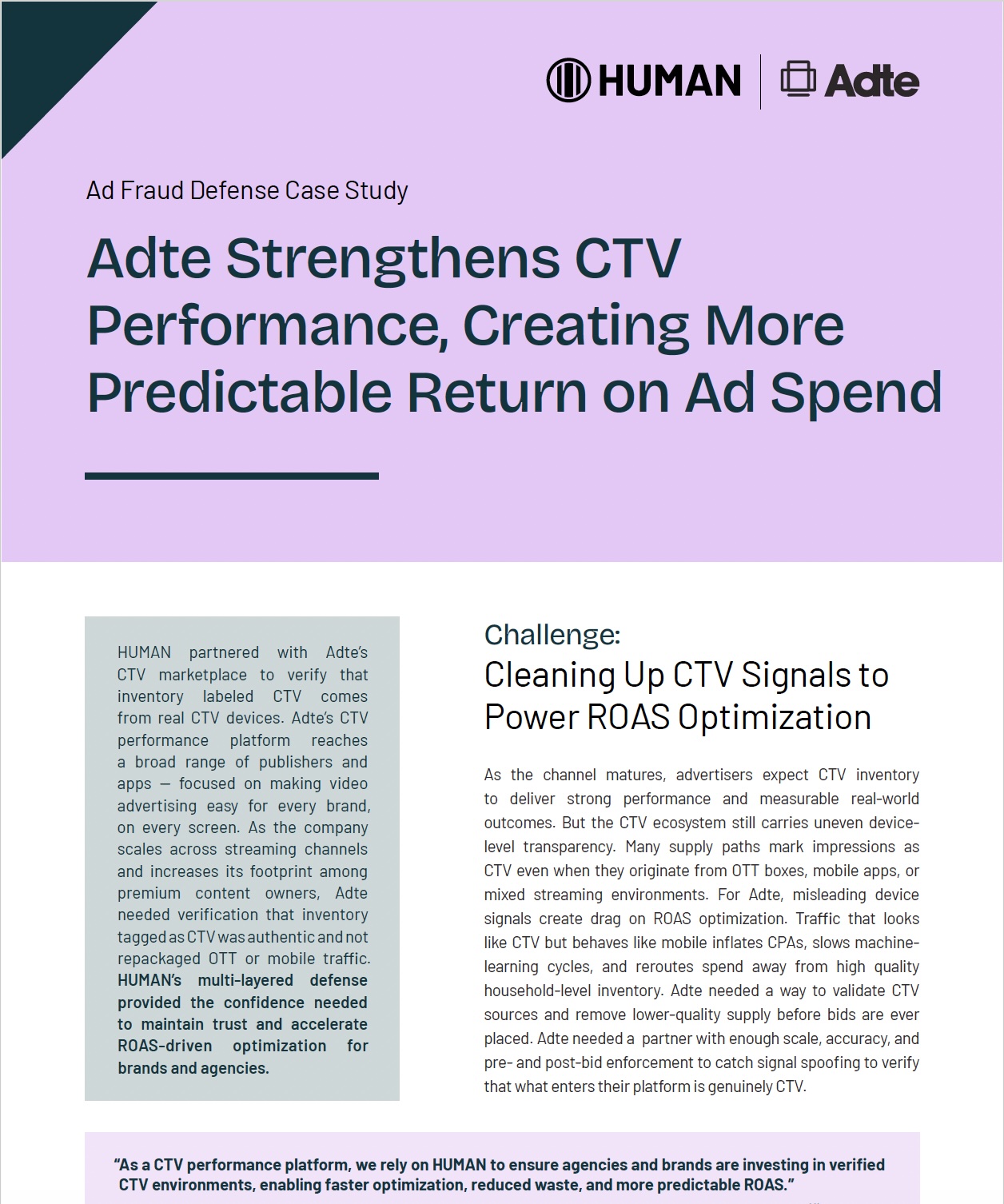 Adte selected HUMAN for its layered detection system powered by Ad Fraud Defense for prebid protection and Ad Fraud Sensor for post-bid analysis. Ad Fraud Defense validates device authenticity before Adte enters an auction, blocking misrepresented OTT or mobile traffic at the source. Ad Fraud Sensor reinforces long-term protection through deeper inspection of delivered impressions, surfacing supply-path manipulation, spoofing, and behavioral anomalies that point to non-CTV environments. With these protections in place, Adte can focus on ROAS modeling and campaign acceleration rather than sorting through inconsistent inventory signals.