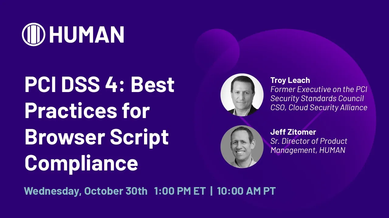 Troy Leach, former executive on the PCI Security Standards Council, and Jeff Zitomer, Senior Director of Product Management at HUMAN, discuss best practices to simplify payment page security and compliance. Learn how to streamline payment page script management and ensure your team is working smarter, not harder.